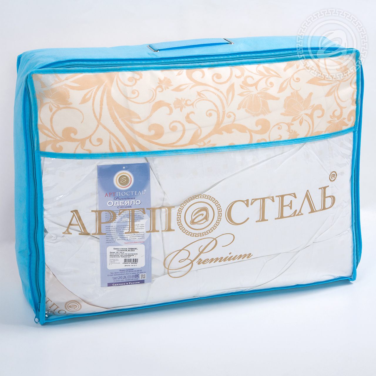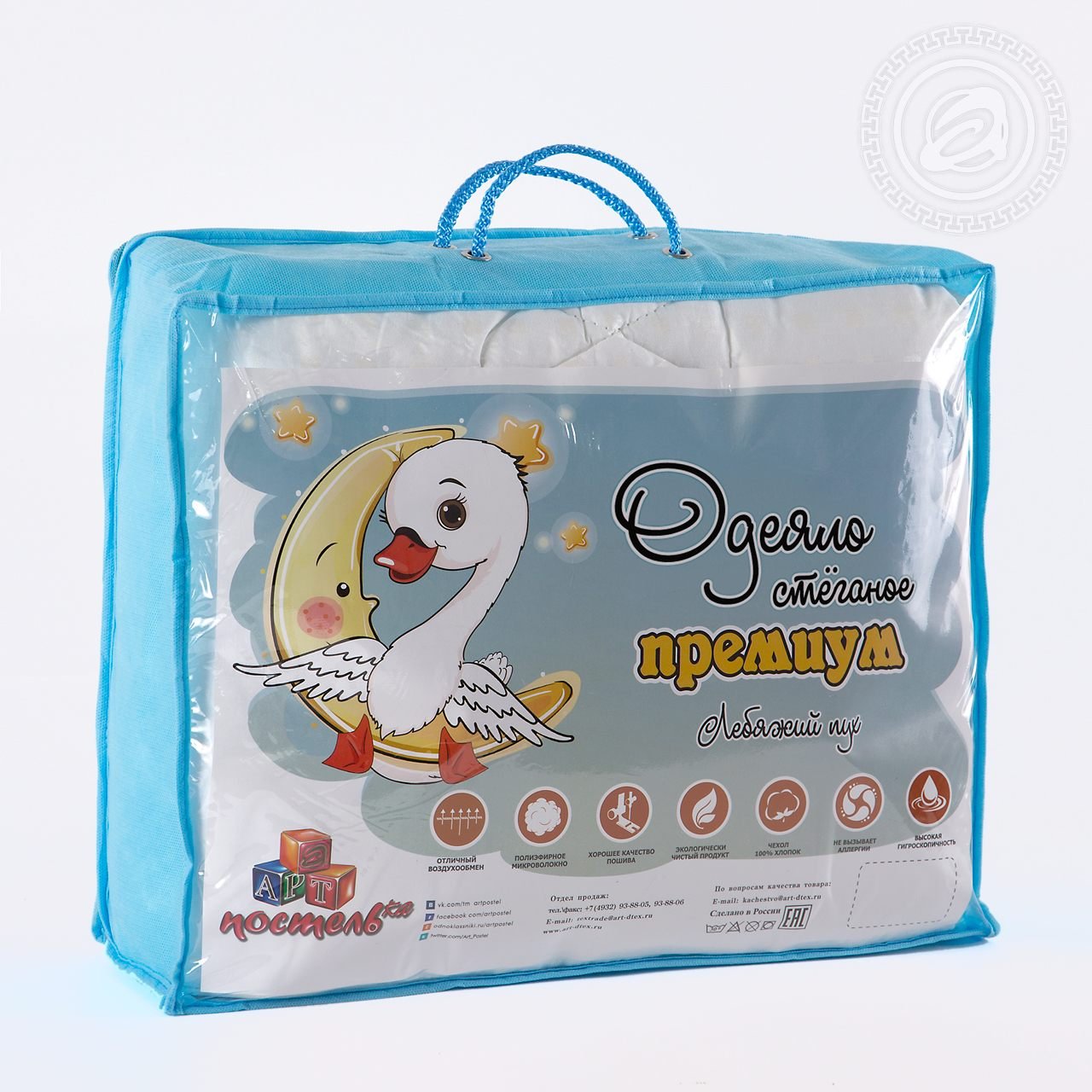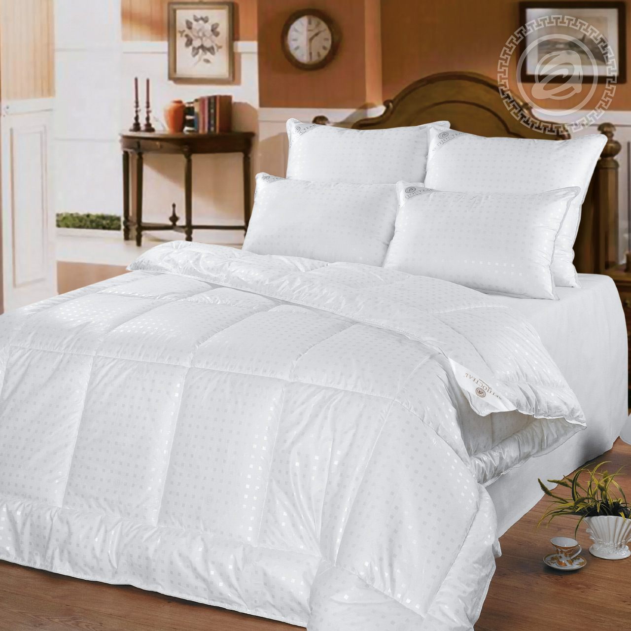 Состав: Наполнитель: Сверхтонкое полиэфирное силиконизированое микроволокно "Лебяжий пух". Плотность: 350 гр/м2. Чехол: Чехол с кантом, декоративная отстрочка - тик пухоперовой (100% хлопок).